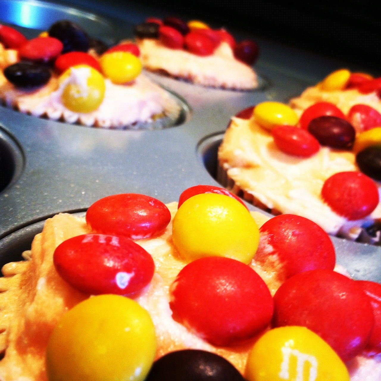 What exactly are inside these gems? Oreos and chocolate chunk cookie dough. M&M’s on top. Logistics are as follows: