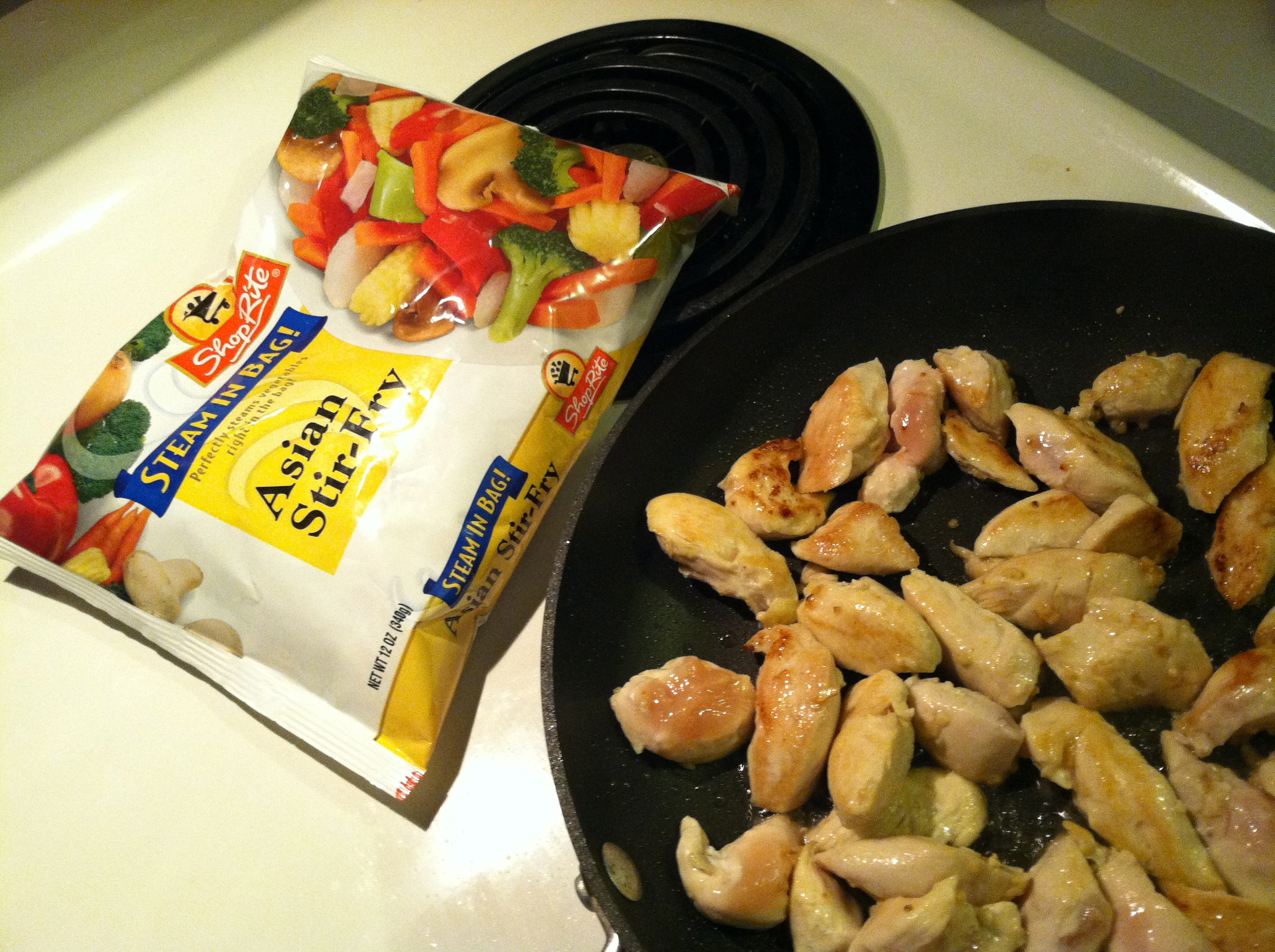 En route from the box home tonight I made a pit stop. Okay, so I made 2 pit stops… the first was the liquor store to replenish my wine supply. THEN I went to the grocery store for ingredients for something quick yet paleo. So, what’s crazy easy enough to make you fall out of your chair after a 54 hour work week? Chicken, vegetables, sauce. Steamable stir fry veggies and PaleoChef Ginger Cilantro sauce… go on do your thang! I’m hungry.