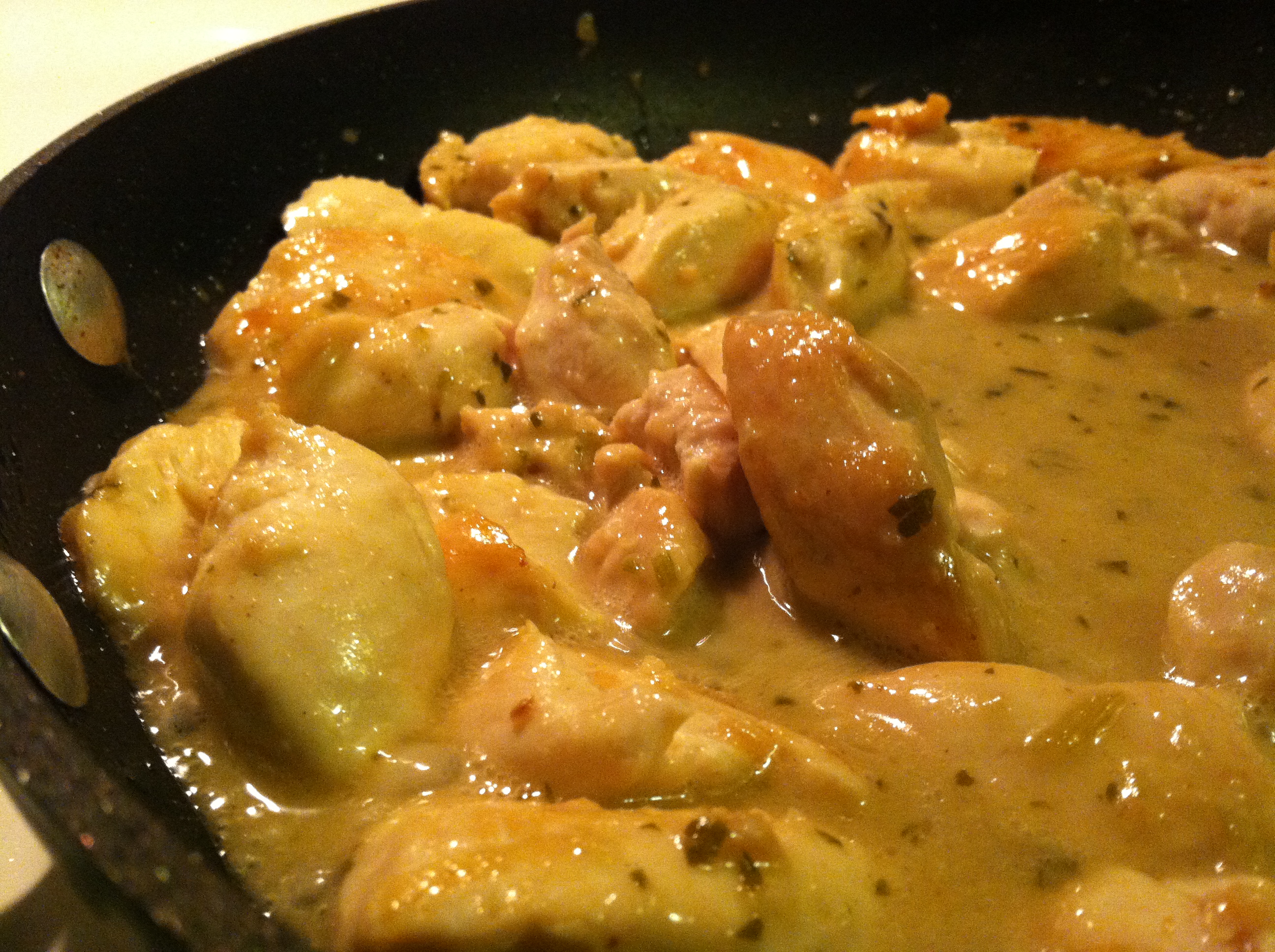 Maybe I could have cut the chicken pieces a bit smaller. I didn’t feel like it. Step one, heat skillet with EVOO. Throw in some minced garlic. Cook the chicken.