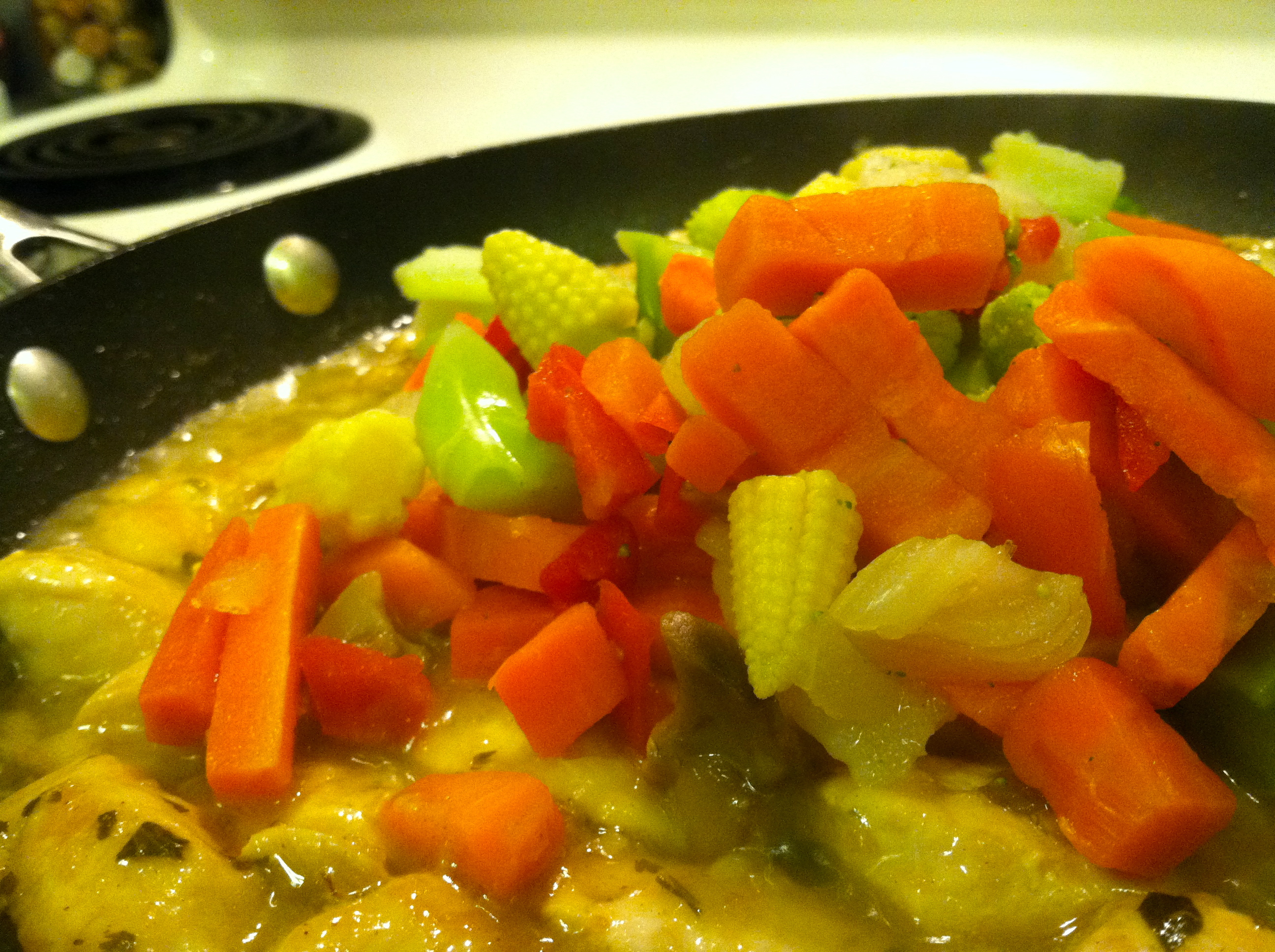 Add in the sauce while you finish off the chicken. Steam veggies. Toss those in too. Reduce over medium heat.
