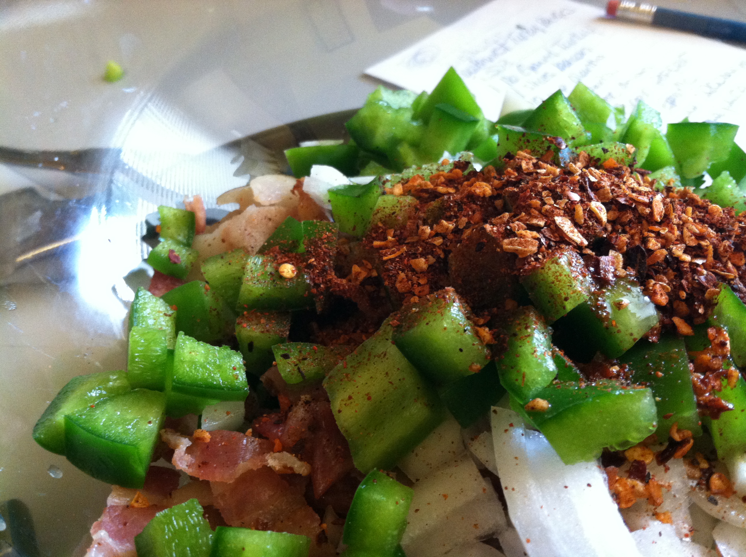 Step 2) Dice up all the fresh ingredients. Don’t put your fingers covered in jalapeno oil near your eyes. Or your tongue, unless you’ve got cojones and/or a high tolerance for hot stuff.