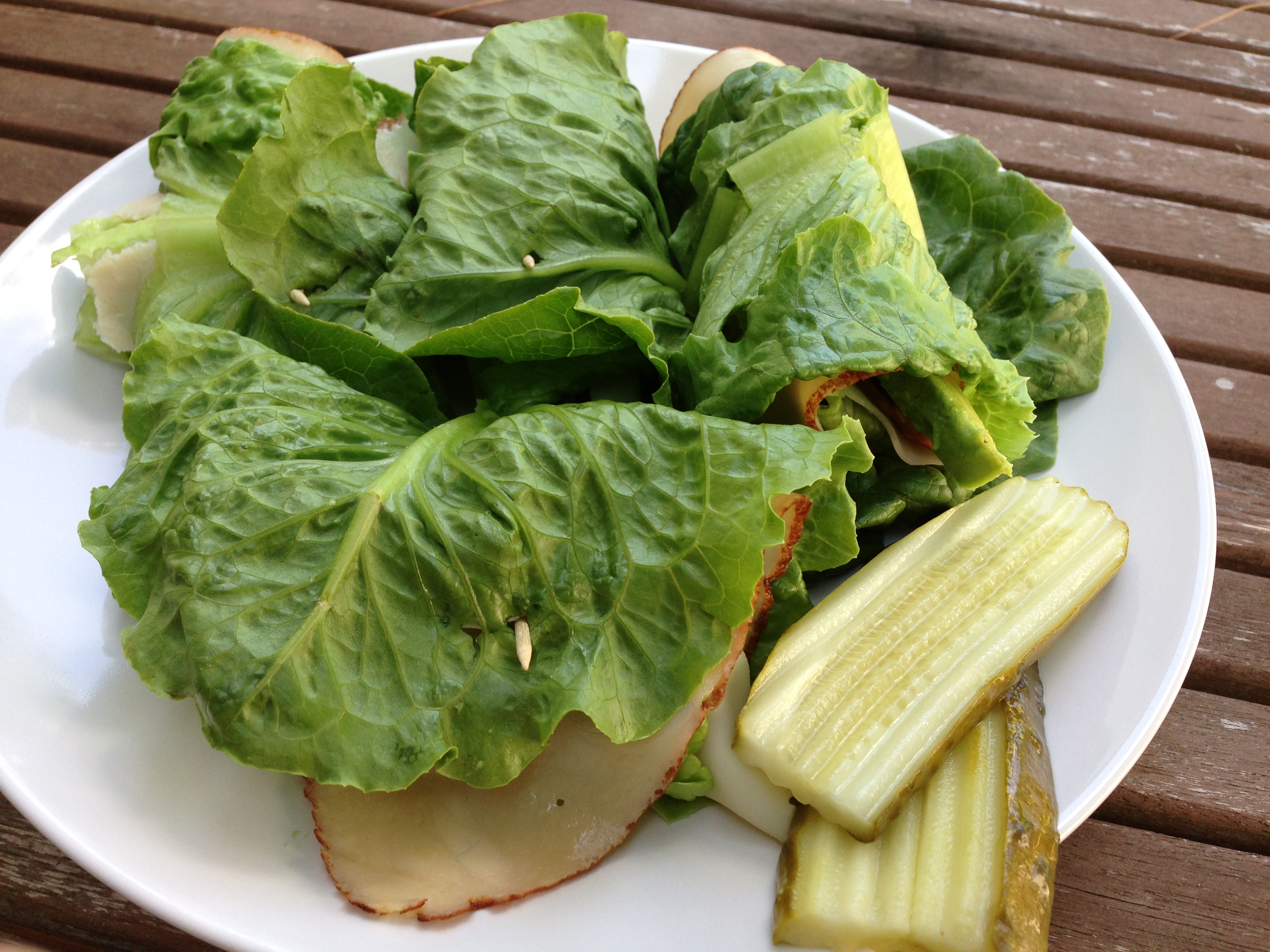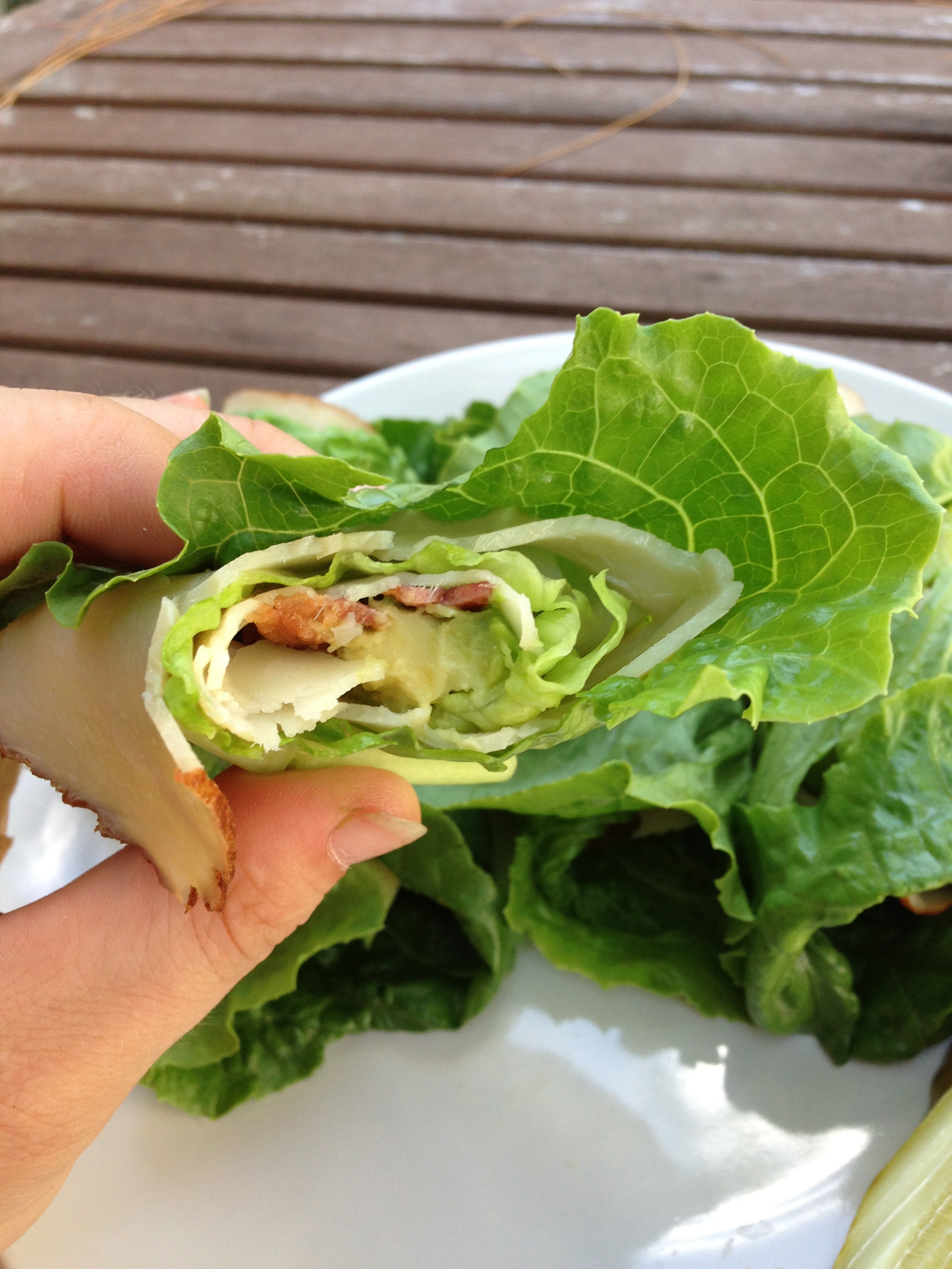 It ought to be common knowledge by now that my making fancy fussy recipes is the exception, and making stupid easy stuff is the rule. I really like it that places like Five Guys and In-N-Out wrap burgers in lettuce. I like to wrap meat in lettuce too. The latest combo appearing on my lunch breaks? A de-breaded version of a Turkey Club Sandwich.