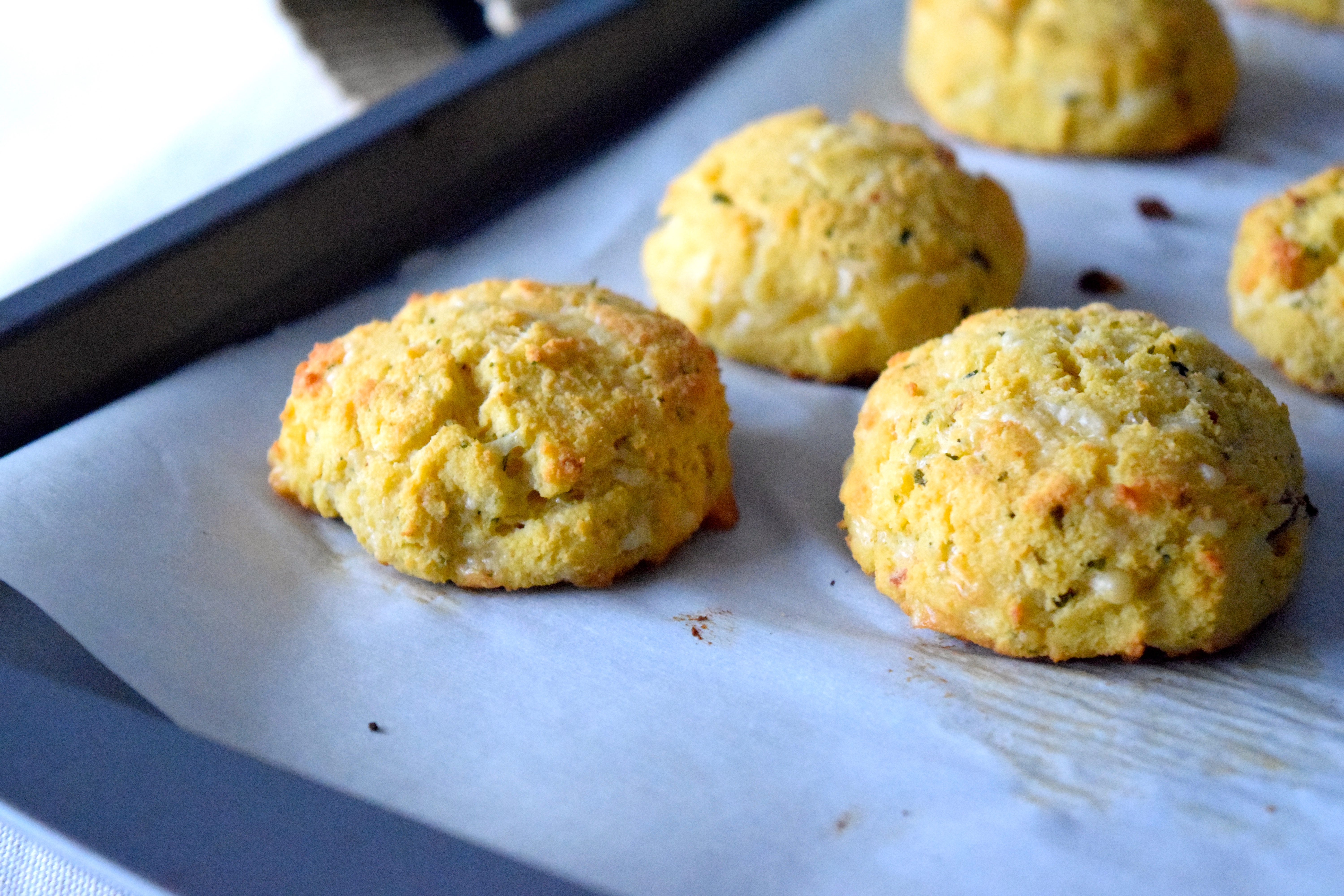6) Portion out 10 biscuits onto a cookie sheet lined with parchment paper. They’ll be the size of monster cookies. (aka one batch of dough should yield 10 small biscuits)