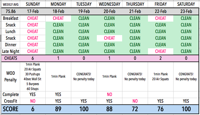 A perfect score is 100 points. You can earn 100 points by eating clean all day long, and going to CrossFit/getting in a workout that day.